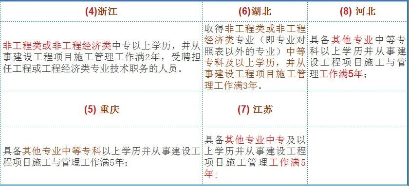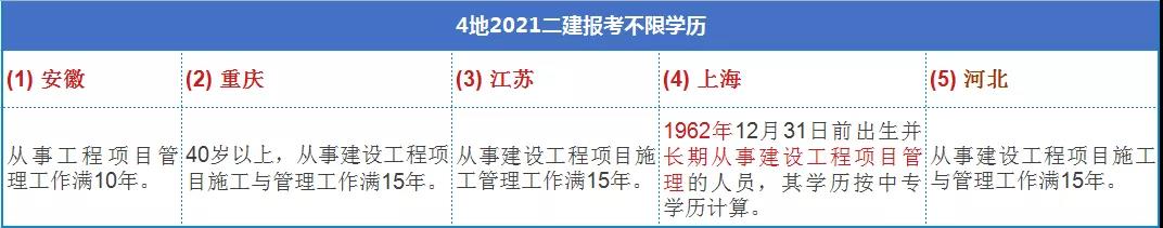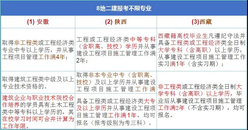(1) 中專及以上學歷,工程或工程經濟專業,從事施工管理工作滿2年;根據21年各地報名公告整理以下二建報考不限學歷、專業的情況,僅供參考:
