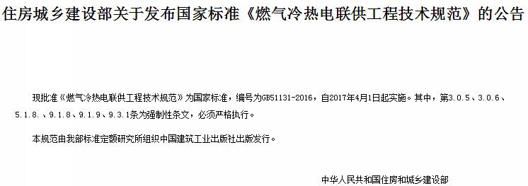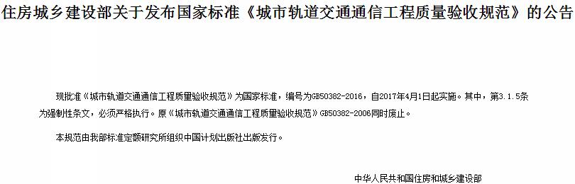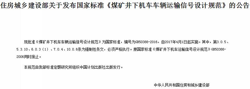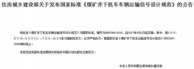 今日,建設部接連發布了8篇國家強制性標準公告,其他包括:《電氣裝置安裝工程 接地裝置施工及驗收規范》、《煤礦立井井筒及硐室設計規范》、《煉油裝置火焰加熱爐工程技術規范》、《煤礦井下機車車輛運輸信號設計規范》、《城市軌道交通通信工程質量驗收規范》、《燃氣冷熱電聯供工程技術規范》、《壓縮天然氣供應站設計規范》和《建筑工程施工質量評價標準》,2017年4月1日起正式實施。