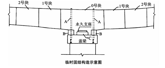 解析:1.A:支座兩側臨時預應力筋;B:臨時支座;C:墊塊。
