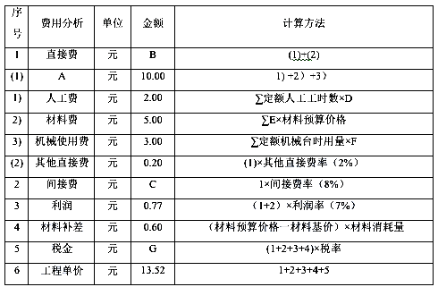 2.A代表基本直接費;B代表10.20;C代表0.82;D代表人工預算單價;E代表定額材料用量;F代表機械臺時費;G代表1.24。