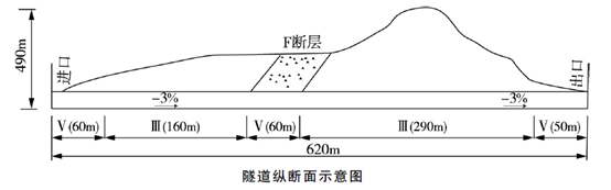 某雙車道公路隧道。全長620m,地層巖性為石灰巖,地下水豐富有一條F斷層破裂帶隧道最大埋深490m,縱坡為-3%。其圍巖級別及長度見隧道縱段面示意圖3.合同總工期為20個月為保證施工安全,施工單位結合項目地質和設備條件,擬在全斷面法、臺階法、單側壁導坑法、CD法、CRD法5種工法中選擇組織施工。