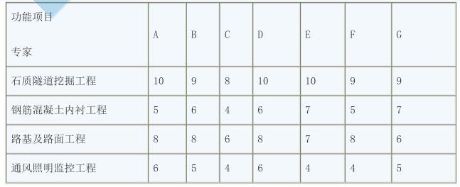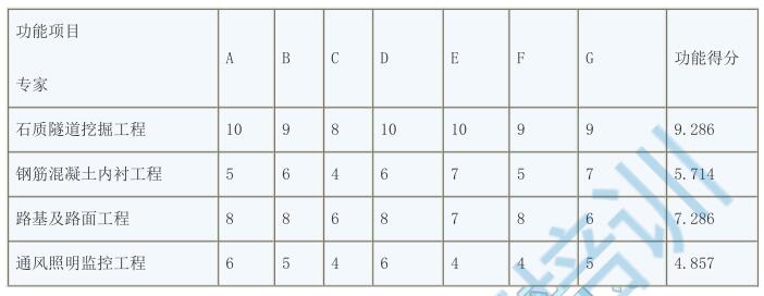某設(shè)計(jì)院承擔(dān)了長約 1.8 公里的高速公路隧道工程項(xiàng)目的設(shè)計(jì)任務(wù)。為控制工程成本,擬對選定的設(shè)計(jì)方案進(jìn)行價(jià)值工程分析。專家組選取了四個主要功能項(xiàng)目,7 名專家進(jìn)行了