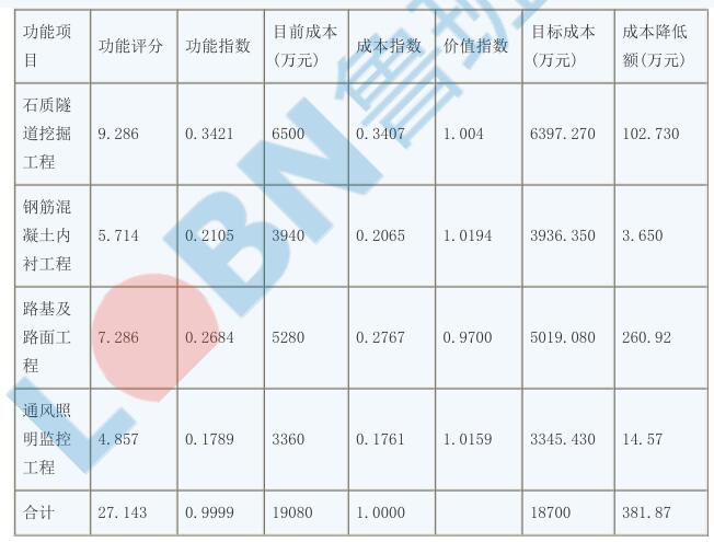 4.成本降低額從大到小排序?yàn)槁坊奥访婀こ獭⑹|(zhì)隧道挖掘工程、通風(fēng)照明監(jiān)控工程、鋼筋混凝土內(nèi)襯工程。所以功能改進(jìn)的前兩項(xiàng)分別為路基及路面工程、石質(zhì)隧道挖掘工程。