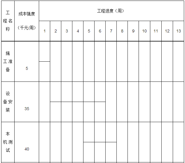 1、根據橫道圖用直方圖形式繪制,按周編制成本計劃 答:根據進度計劃橫道圖,繪制進度計劃成本矩陣見下表: