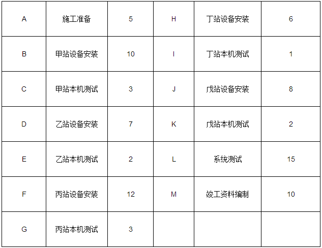 事件一:乙站、丙站設備均推遲 2 天運到機房; 事件二:施工單位儀表比計劃最早進場時間推遲 5 天時間; 事件三:在丁站本機測試中,儀表故障造成測試工作延遲 6 天;