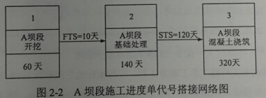 事件三:結(jié)合現(xiàn)場及資源情況,承包人對新的施工進度計劃進行了局部調(diào)整,A壩段采用搭接施工,其單代號搭接網(wǎng)絡(luò)如圖2-2所示:
