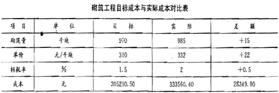 事件四:該項目的 GZL 保溫砌塊砌筑工程目標(biāo)成本為 305210.50 元,實際成本為 333560.40 元,比目標(biāo)成本超支了 28349.90 元,施工單位運用成本分析的基本方法對 GZL 保溫砌塊砌筑工程施工成本進(jìn)行分析:采用因素分析法,分析砌筑量、單價、損耗率等因素的變動對實際成本的影響程度,有關(guān)對比數(shù)據(jù)見下表。