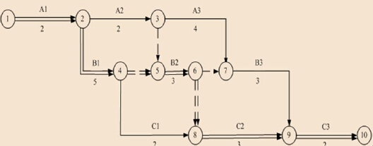 關(guān)鍵線路為:①→②→④→⑤→⑥→⑧→⑨→⑩;①→②→④→⑤→⑥→⑦→⑨→⑩;其工期 T=2+5+3+3+2=15(月)