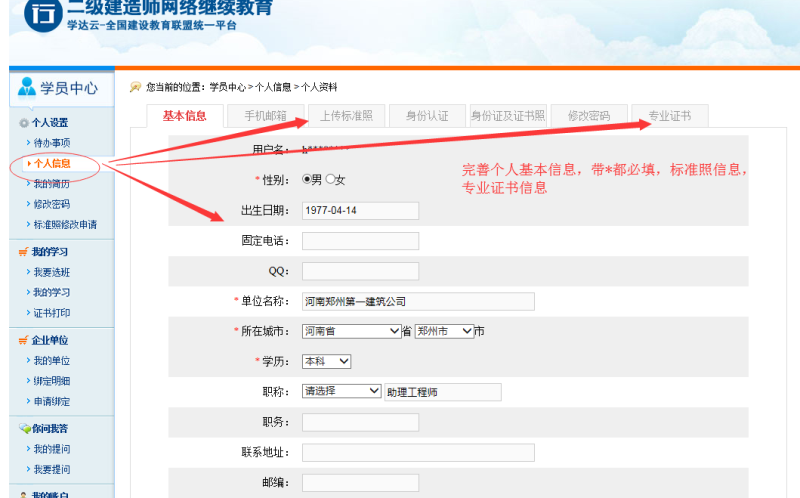2.登陸成功后,完善個人基本信息,標準照頭像信息,證書信息。