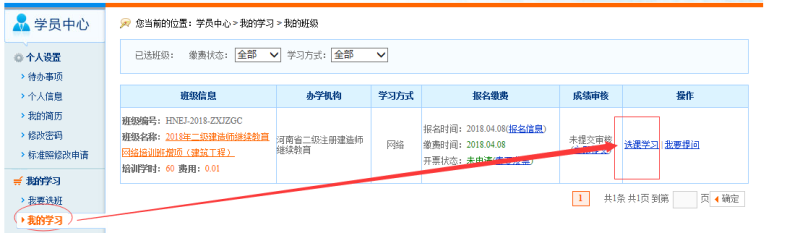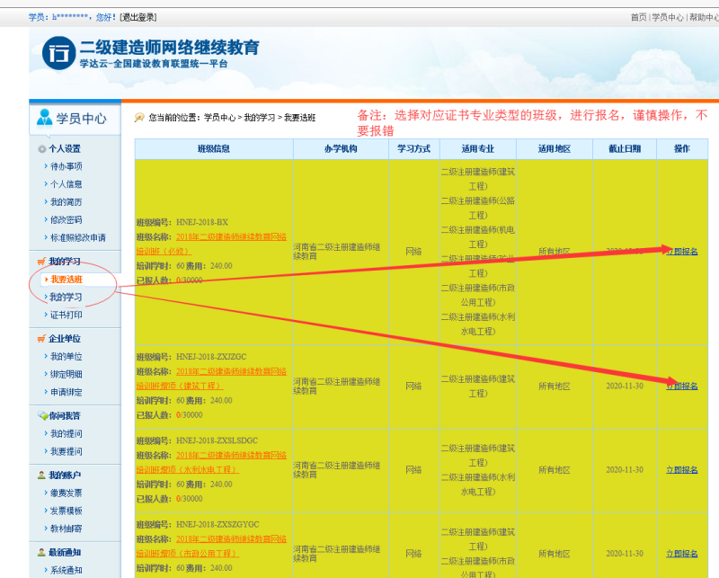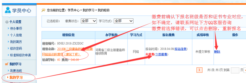 4. 報名成功后,點擊【我的學習】中 【立即繳費】鏈接進入 繳費,繳費前確認報名班級適用專業是否和本人證書專業一致。