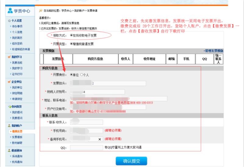 5. 繳費前,先完善發票信息,發票統一采用電子發票,繳費后20個工作日開出。