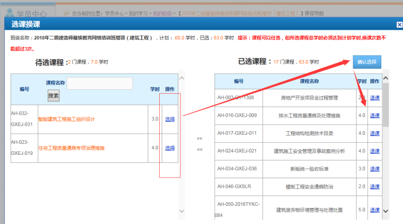 6. 繳費完成后,點擊 【我的學習】中,【選課學習】鏈接進去選課,選擇學時達到 60 學時即可,最多不超過65學時。