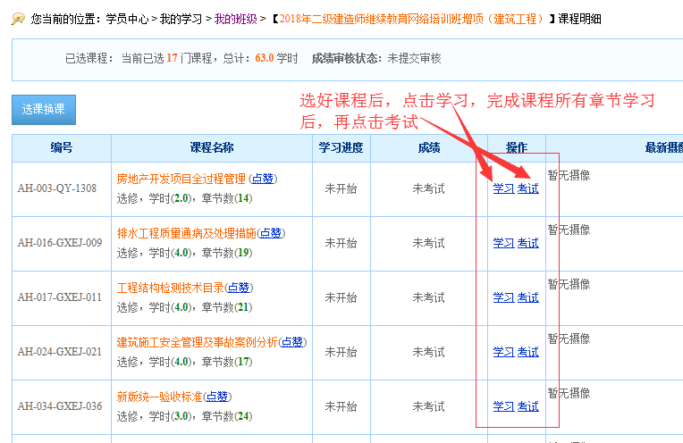 7. 選好課后,點擊學習,完成1門課程所有章節學習后,再點擊【考試】。
