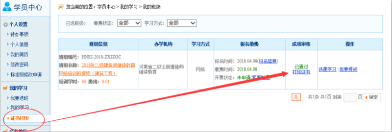 10. 審核通過后,點擊【證書打印】菜單,點擊 打印證書 鏈接。