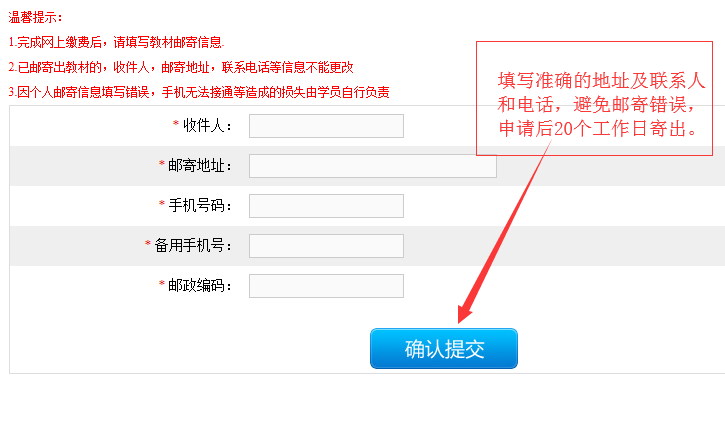 11.教材郵寄,針對已報讀主項必修專業的學員申請。(請認真填寫地址及聯系電話,避免不能郵寄)
