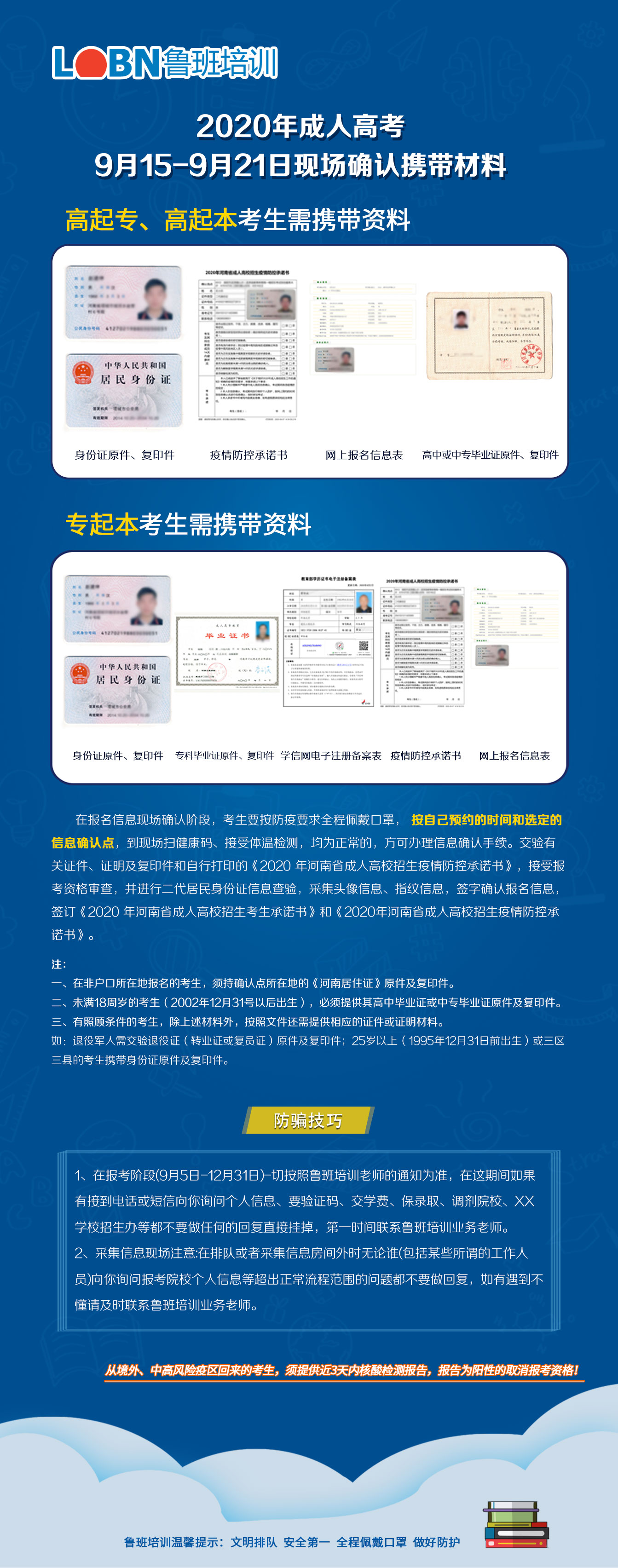 在報(bào)名信息現(xiàn)場確認(rèn)階段,考生要按防疫要求全程佩戴口罩,按自己預(yù)約的時間和選定的信息確認(rèn)點(diǎn),到現(xiàn)場掃健康碼、接受體溫檢測,均為正常的,方可辦理信息確認(rèn)手續(xù)。交驗(yàn)有關(guān)證件、證明及復(fù)印件和自行打印的《2020年河南省成人高校招生疫情防控承諾書》,接受報(bào)考資格審查,并進(jìn)行二代居民身份證信息查驗(yàn),采集頭像信息、指紋信息,簽字確認(rèn)報(bào)名信息,簽訂《2020年河南省成人高校招生考生承諾書》和《2020年河南省成人高校招生疫情防控承諾書》。凡經(jīng)過網(wǎng)上報(bào)名而未進(jìn)行報(bào)名信息確認(rèn)的考生,網(wǎng)上報(bào)名無效。體溫檢測為異常的,在當(dāng)?shù)匦l(wèi)生防疫部門的指導(dǎo)評估后,按我省疫情防控要求處理。從境外和中高風(fēng)險疫區(qū)回來的考生、無癥狀感染者經(jīng)治愈的考生,必須提供近3天的核酸檢測報(bào)告,核酸檢測報(bào)告為陽性的,取消其報(bào)考資格。
