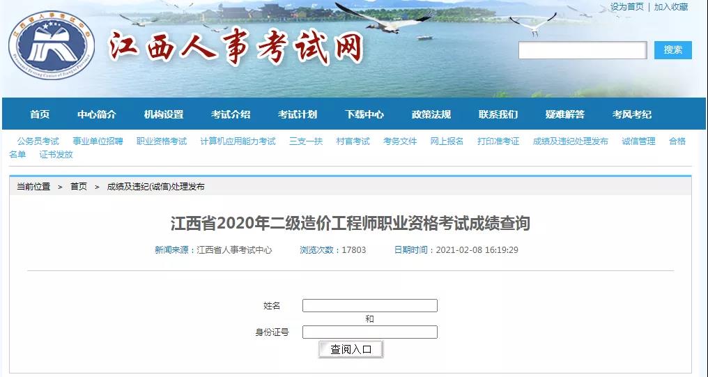 江西省2020年二級造價工程師職業(yè)資格考試成績可以查詢了!