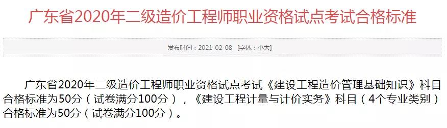 廣東省2020年二級造價工程師職業(yè)資格試點考試《建設(shè)工程造價管理基礎(chǔ)知識》科目合格標(biāo)準(zhǔn)為50分(試卷滿分100分),《建設(shè)工程計量與計價實務(wù)》科目(4個專業(yè)類別)合格標(biāo)準(zhǔn)為50分(試卷滿分100分)。