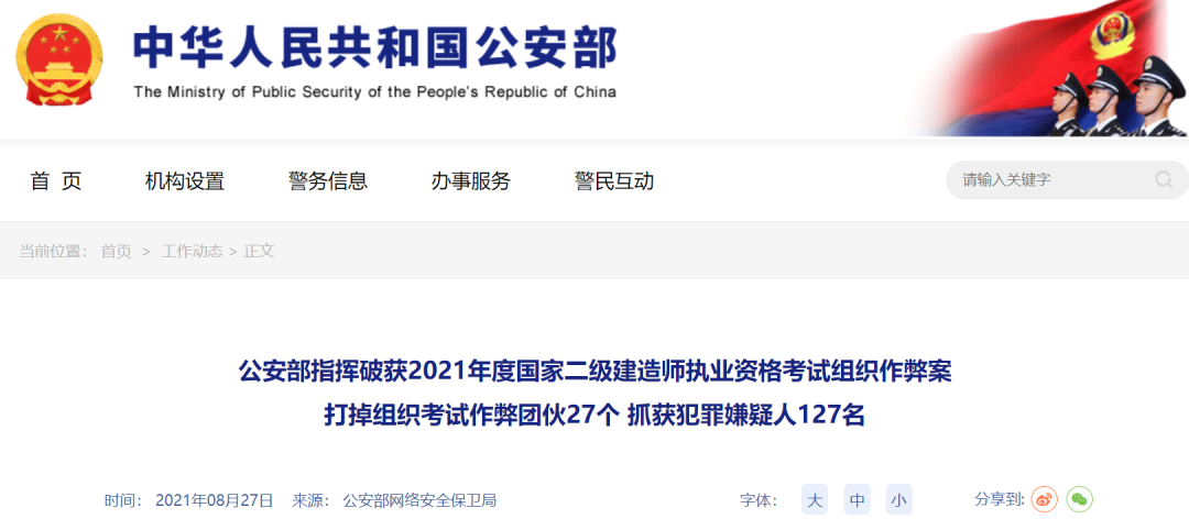 近日,按照公安部統一指揮部署,江蘇、湖北、江西等多省市公安機關對2021年度國家二級建造師執業資格考試(以下簡稱二建考試)組織作弊案進行偵辦, 一舉打掉組織考試作弊團伙27個,抓獲犯罪嫌疑人127名 ,查獲一批作弊考生,及時鏟除了試題泄露源頭,有效消除了試題泄露安全隱患,有力維護了公平公正考試秩序。