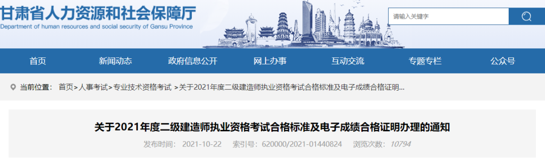 各市州人力資源和社會保障局,省直及中央在甘有關單位人事(干部)處:現(xiàn)將2021年度我省二級建造師執(zhí)業(yè)資格考試成績合格標準及電子合格證明辦理相關事宜通知如下: