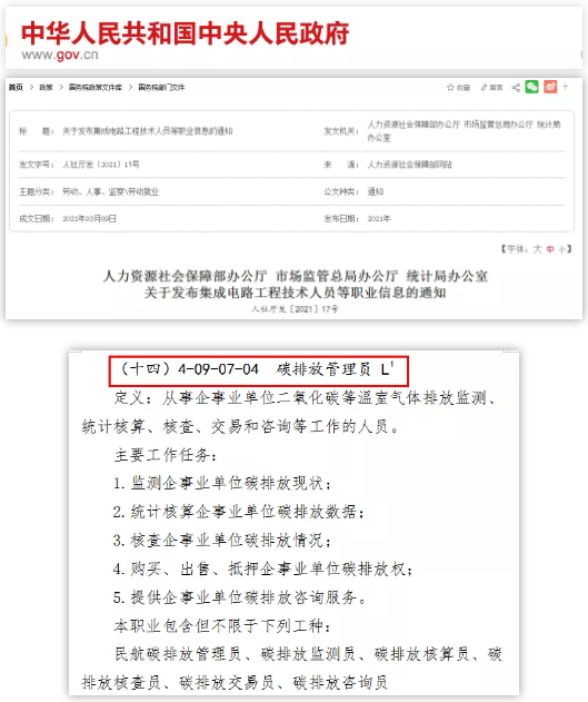 (3) 且在2021年3月,人社部、國家市場監管總局、國家統計局發布了 18 項新職業,"碳排放管理員" 被列入國家職業序列,并在該職業下設置了:“民航碳排放管理員”、“碳排放監測員”、“碳排放核算員”、“碳排放核查員”、“碳排放交易員”、“碳排放咨詢員”6個工種。通知如下: