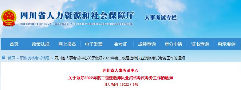 根據(jù)四川省人力資源和社會(huì)保障廳《關(guān)于印發(fā)四川省2022年度專業(yè)技術(shù)人員資格考試工作計(jì)劃的通知》(川人社廳辦發(fā)〔2022〕10號(hào))、四川省人力資源和社會(huì)保障廳《關(guān)于做好我省專業(yè)技術(shù)人員資格考試告知承諾制有關(guān)工作的通知》(川人社辦發(fā)〔2020〕14號(hào))以及四川省人力資源和社會(huì)保障廳、四川省住房和城鄉(xiāng)建設(shè)廳《關(guān)于做好我省二級(jí)建造師執(zhí)業(yè)資格考試工作的通知》(川人社辦發(fā)〔2014〕4號(hào))等文件精神,為切實(shí)做好我省2022年度二級(jí)建造師執(zhí)業(yè)資格考試考務(wù)工作,現(xiàn)將有關(guān)事項(xiàng)通知如下: