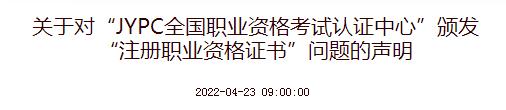 四、“JYPC全國職業資格考試認證中心”頒發的所謂注冊職業資格證書不具有相應的資格資質,無法作為職稱評審、國家企事業單位崗位聘用和職務職級晉升、注冊執業、繼續教育、積分落戶、個稅抵扣等的依據。