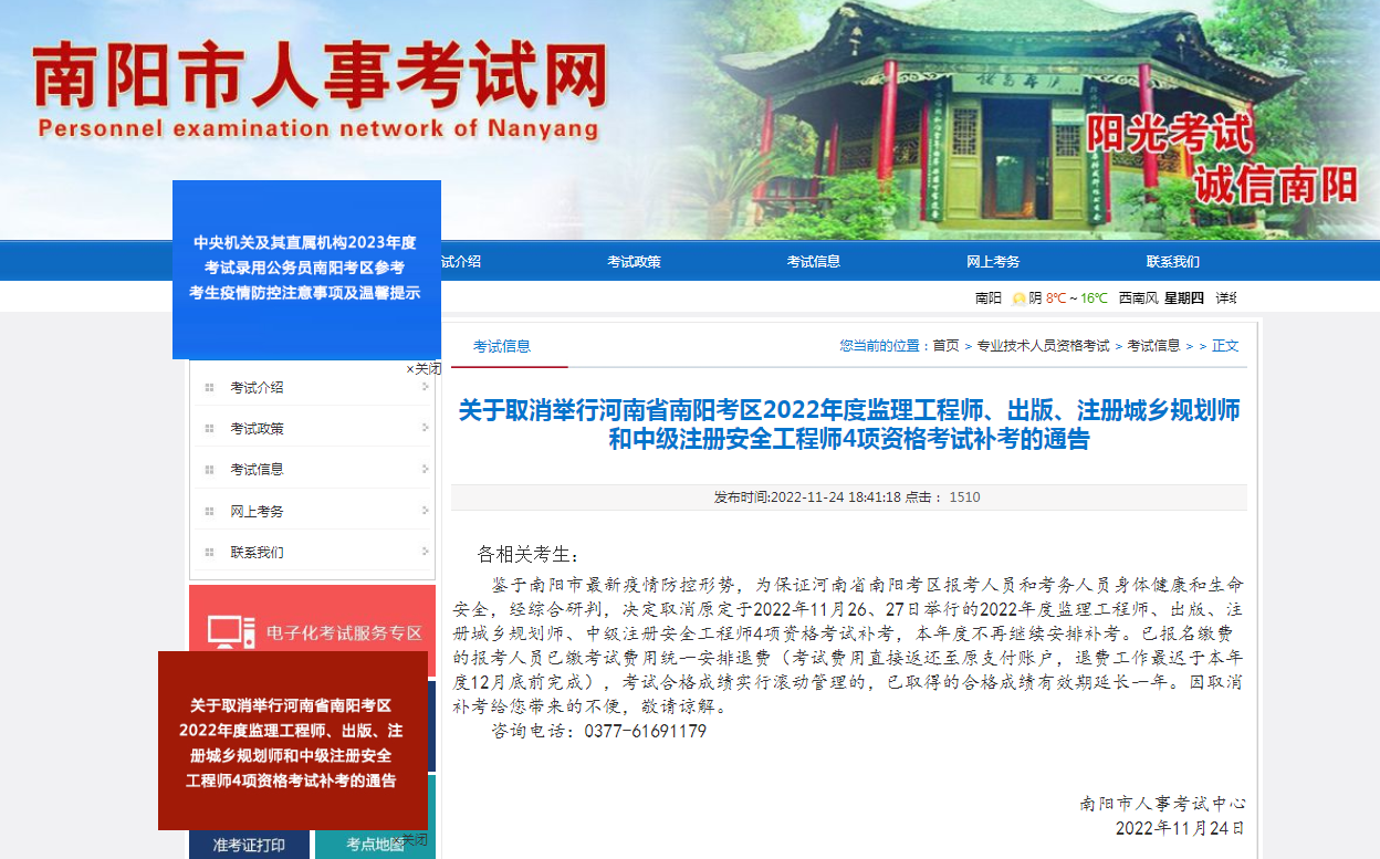 11月24日南陽市人事考試網發布了《關于取消舉行河南南陽考區 2022年度監理工程師、出版、注冊城鄉規劃師和 中級注冊安全工程師4項資格考試補考的通告》,取消舉行河南南陽考區 2022年度監理工程師、出版、注冊城鄉規劃師和 中級注冊安全工程師4項資格考試補考,本年度不再安排補考且無法調劑到其他地區考試,12月底完成統一退費。