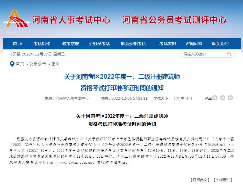 昨日:河南人事考試網發布了《關于河南考區2022年度一、二級注冊建筑師資格考試打印準考證時間的通知》,2022年度一級注冊建筑師資格考試河南考區的補考于12月10日、11日、17日、18日舉行,2022年度二級注冊建筑師資格考試河南考區的補考于12月10日、11日舉行。請網上已繳費的考生于2022年12月8日9:00至12月11日17:00,登錄中國人事考試網(http://www.cpta.com.cn)自行打印準考證。