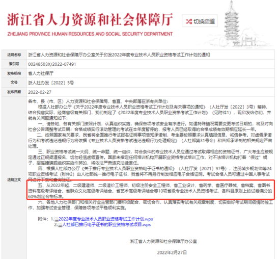 浙江省人社廳發文:自2022年起,二建各科目原則上按試卷滿分的60%劃定合格標準。