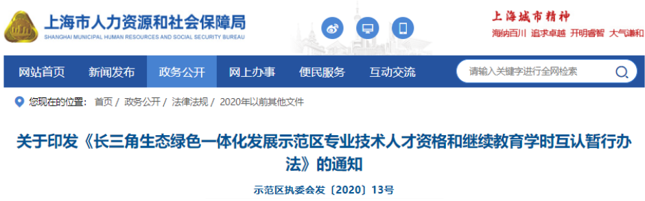 2020年9月,上海市人力資源和社會保障局、江蘇省人力資源和社會保障廳、浙江省人力資源和社會保障廳印發《長三角生態綠色一體化發展示范區專業技術人才資格和繼續教育學時互認暫行辦法》,明確:
