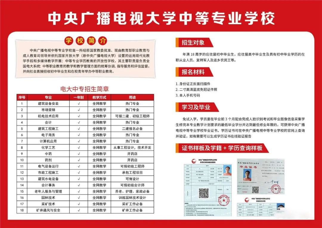 電大中專滿18周歲即可報考一年制中專,一年后拿中專畢業證,普通中專學制大多都是在2-3年電大中專相比普通中專來說,在急需考證的情況下下,學期更短、費用更低,早畢業拿證早搶占先機