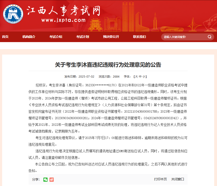 最近江西人事考試網通報了一個一建考生的違紀案例,看完真是讓人唏噓——四年考下來的三個一建證書,因為材料造假,全部作廢!