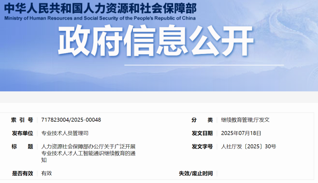 最近,人社部在官網(wǎng)發(fā)布了一則《關(guān)于廣泛開(kāi)展專(zhuān)業(yè)技術(shù)人才人工智能通識(shí)繼續(xù)教育的通知》,要求全體專(zhuān)業(yè)技術(shù)人員開(kāi)展人工智能通識(shí)繼續(xù)教育。