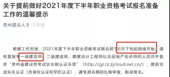 根據(jù)工作安排,2021年度下半年職業(yè)資格考試報(bào)名將于6月下旬起陸續(xù)開始,請(qǐng)有意報(bào)考一級(jí)建造師、二級(jí)建造師、勘察設(shè)計(jì)工程師以及房地產(chǎn)估價(jià)師的人員盡早登錄“貴州省建設(shè)類考試實(shí)名制認(rèn)證系統(tǒng)”,提前完成實(shí)名認(rèn)證(含身份認(rèn)證和學(xué)歷認(rèn)證),避免報(bào)名期間扎堆審查,貽誤報(bào)名。