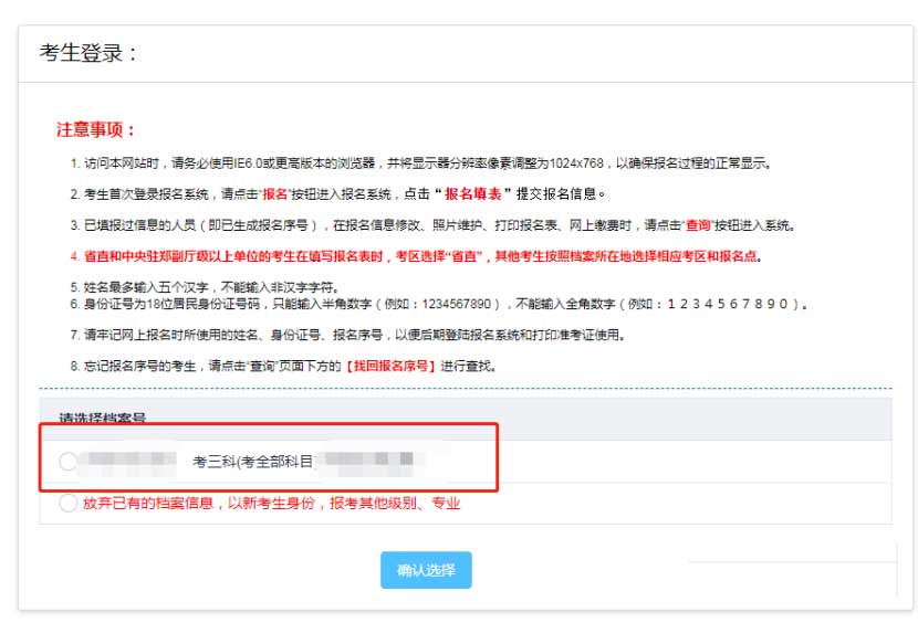 新考生(第一次參加考試的考生):不會出現(xiàn)檔案號 會直接開始下一步老考生(之前參加過考試的考生):會現(xiàn)檔案號 選擇檔案號進行報名