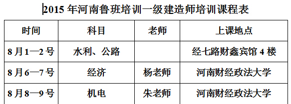 溫馨提示:2015年鄭州魯班培訓一級建造師精講課程在河南財經政法大學文北校區(東風路與文化路交叉口)授課,歡迎前來試聽,現場交費更優惠,具體優惠請咨詢現在鄭州魯班培訓老師,
