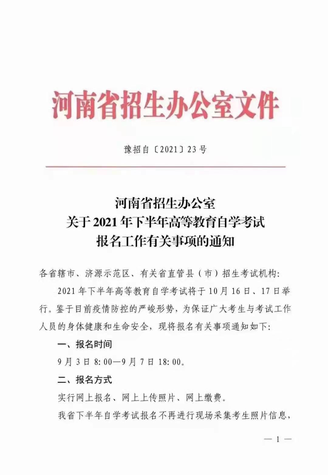河南省招生辦公室發(fā)布【關(guān)于2021年下半年高等教育自學(xué)考試報(bào)名工作有關(guān)事項(xiàng)的通知】,明確2021年下半年高等教育自學(xué)考試將于10月16日、17日舉行,報(bào)名時(shí)間為9月3日——9月7日。