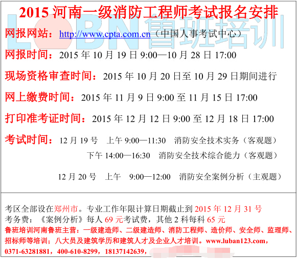 2015年河南一級消防工程師考試報名安排