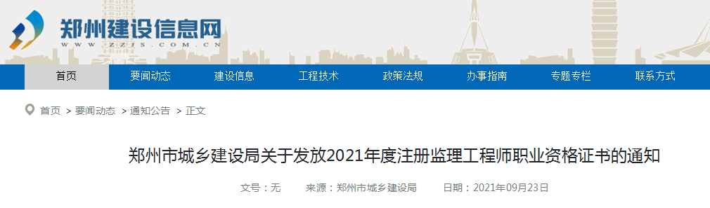 今日:鄭州建設信息網發布了《鄭州市城鄉建設局關于發放2021年度注冊監理工程師職業資格證書的通知》,通知(《鄭州市城鄉建設局關于發放2021年度注冊監理工程師職業資格證書的通知》以下簡稱通知)要求通過2021年注冊監理工程師職業資格考試通過的考生請于9月27日起(工作日下午14:00-17:30)到鄭州市榆林北路6號鄭州市工程質量監督站409辦公室領取自己的證書,須本人領取,領取時攜帶本人身份證原件及復印件。聯系電話:0371-67881652,建議如必要請先撥打聯系電話確認,以免不必要的麻煩。