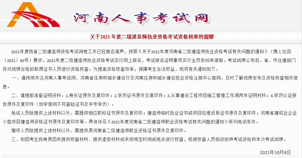 2021年度我省二級(jí)建造師資格考試閱卷工作已經(jīng)接近尾聲,按照《關(guān)于2021年度河南省二級(jí)建造師執(zhí)業(yè)資格考試有關(guān)問題的通知》(豫人社函〔2021〕60號(hào))要求,2021年度二級(jí)建造師執(zhí)業(yè)資格考試實(shí)行網(wǎng)上報(bào)名,考試報(bào)名證明事項(xiàng)實(shí)行全員告知承諾制。考試成績(jī)公布后,省、市住建部門將對(duì)成績(jī)合格擬取得證書人員進(jìn)行資格核查。為提高資格核查效率,保障考生合法權(quán)益,現(xiàn)將有關(guān)通知如下。