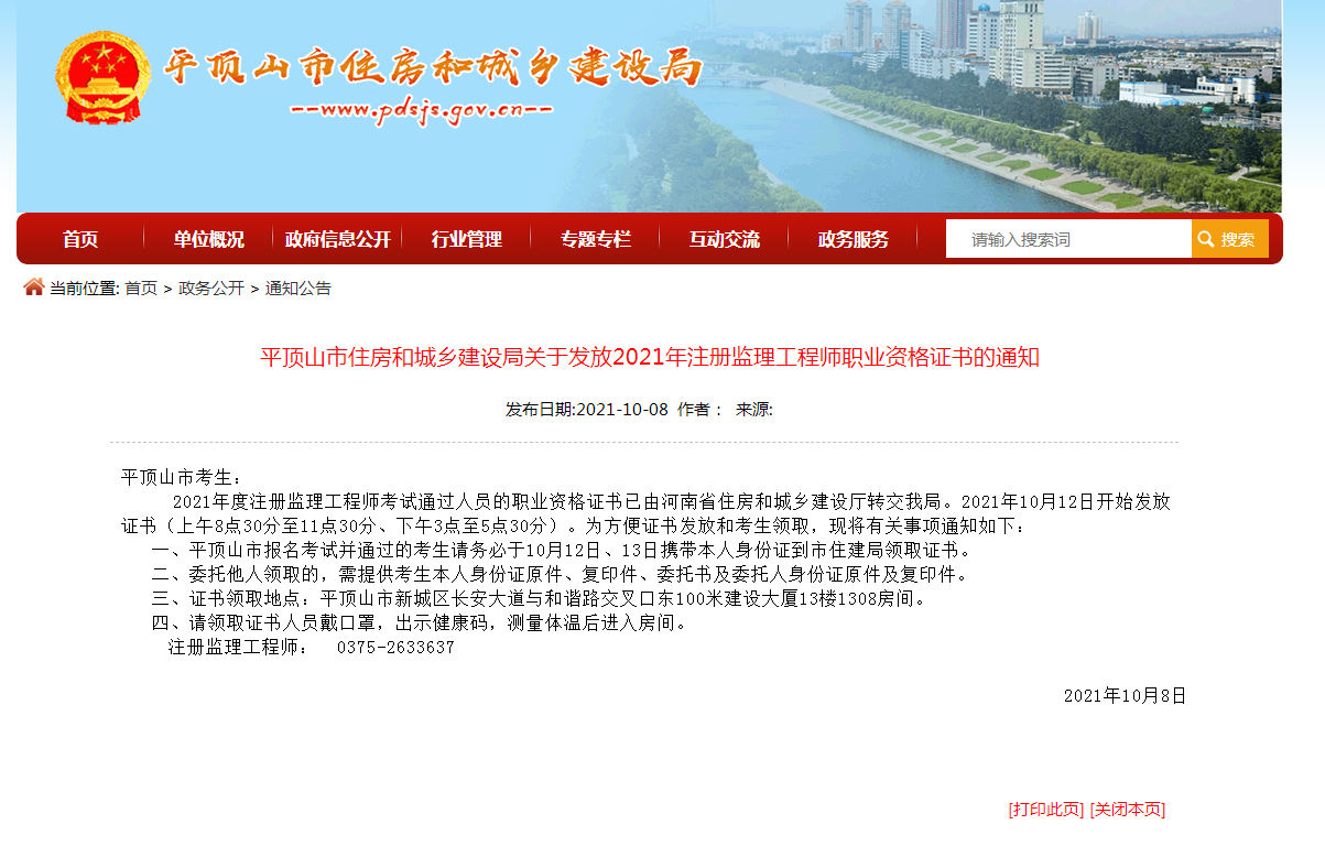 10月8日,平頂山市住房和城鄉(xiāng)建設(shè)局發(fā)布了2021年注冊監(jiān)理工程師職業(yè)資格證書的通知,平頂山2021年度注冊監(jiān)理工程師考試通過人員的職業(yè)資格證書已由河南省住房和城鄉(xiāng)建設(shè)廳轉(zhuǎn)交平頂山市住房和城鄉(xiāng)建設(shè)局,2021年10月12日開始發(fā)放證書(上午8點(diǎn)30分至11點(diǎn)30分、下午3點(diǎn)至5點(diǎn)30分)。為方便證書發(fā)放和考生領(lǐng)取,現(xiàn)將有關(guān)事項(xiàng)通知如下: