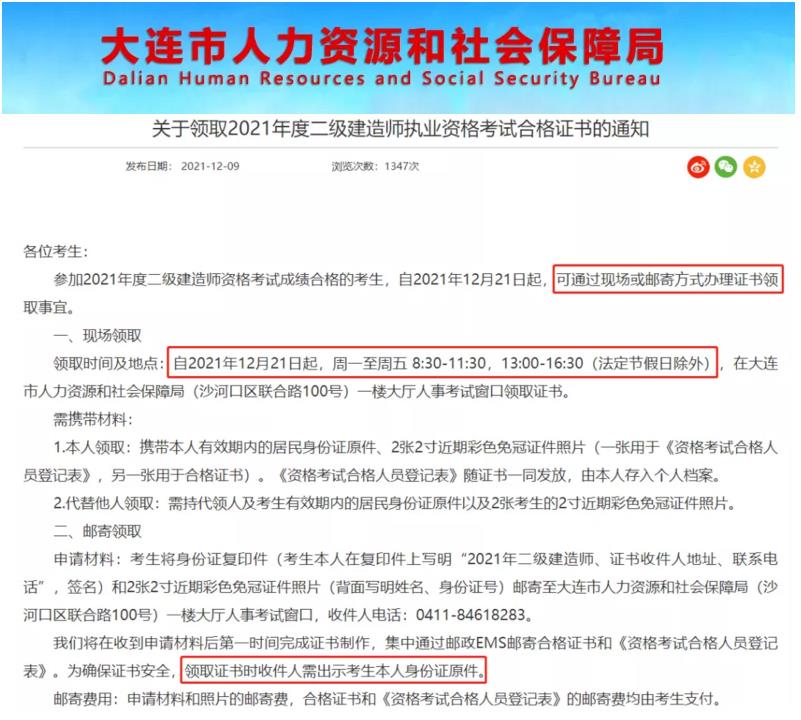 自2021年12月21日起,可通過現場或郵寄方式辦理證書領取事宜。
