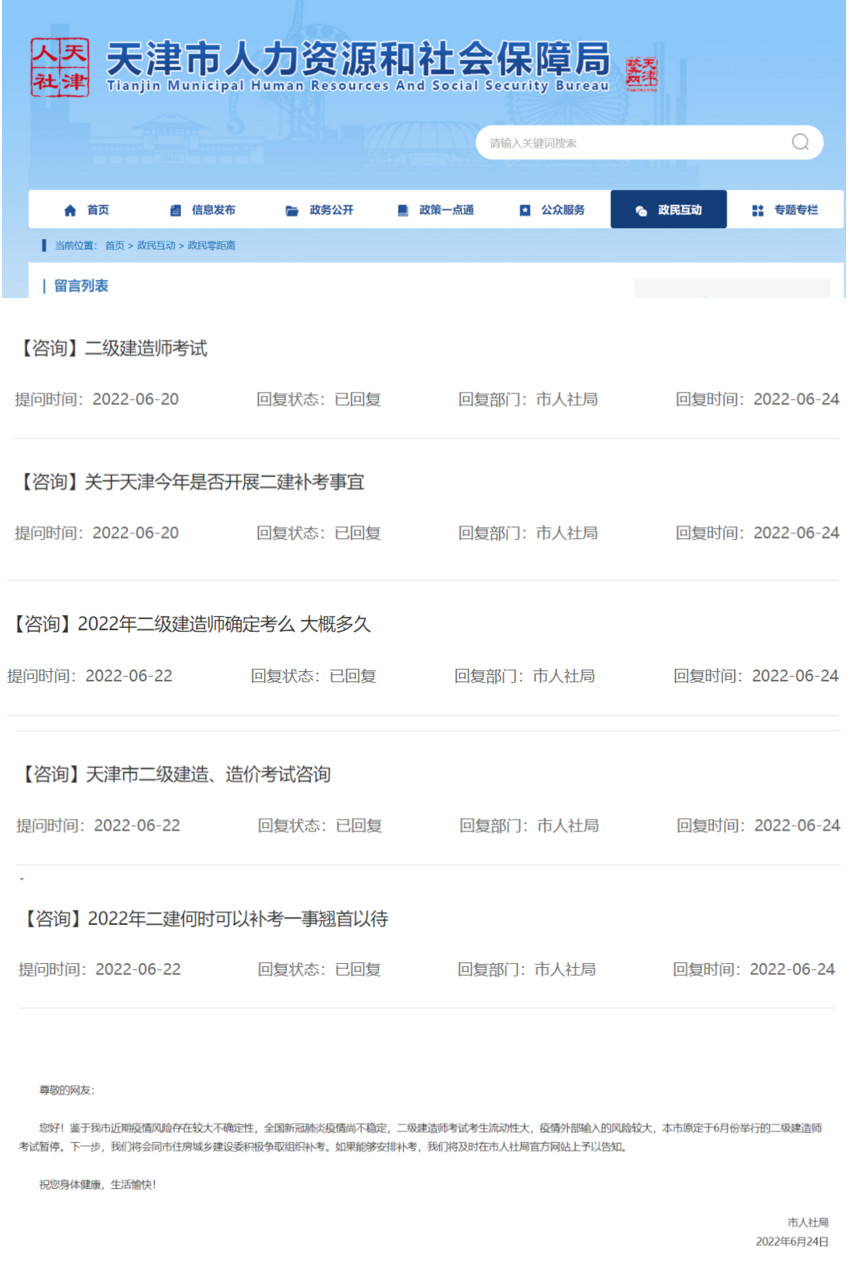 最近,有很多考生在天津人社局咨詢今年是否可以重新組織二建考試,官方給出了統一的答復。(注:信息來源于天津市人力資源和社會保障局。)