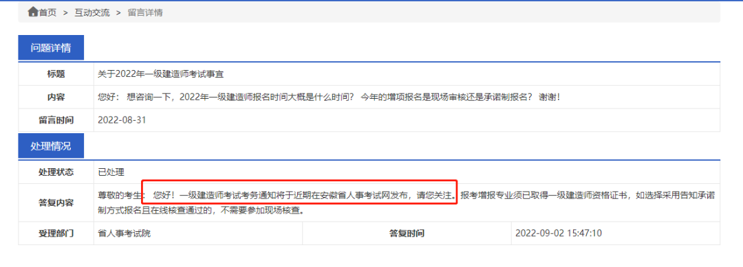【答】您好!一級建造師考試考務(wù)通知將于近期在安徽省人事考試網(wǎng)發(fā)布,請您關(guān)注。報考增報專業(yè)須已取得一級建造師資格證書,如選擇采用告知承諾制方式報名且在線核查通過的,不需要參加現(xiàn)場核查。