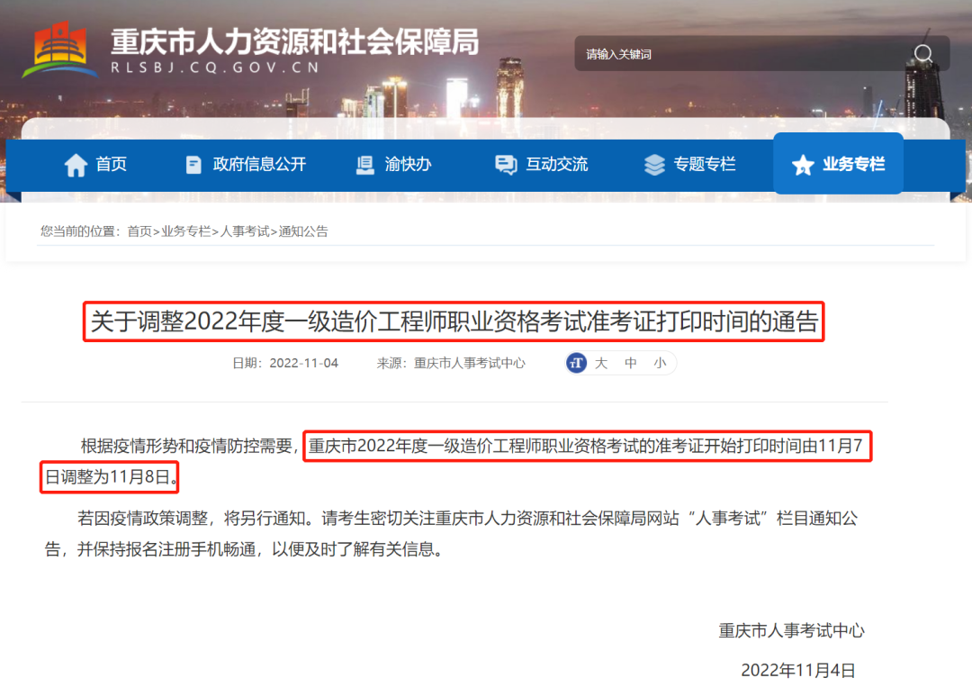 重慶市2022年度一級造價工程師職業資格考試的準考證開始打印時間由11月7日調整為11月8日