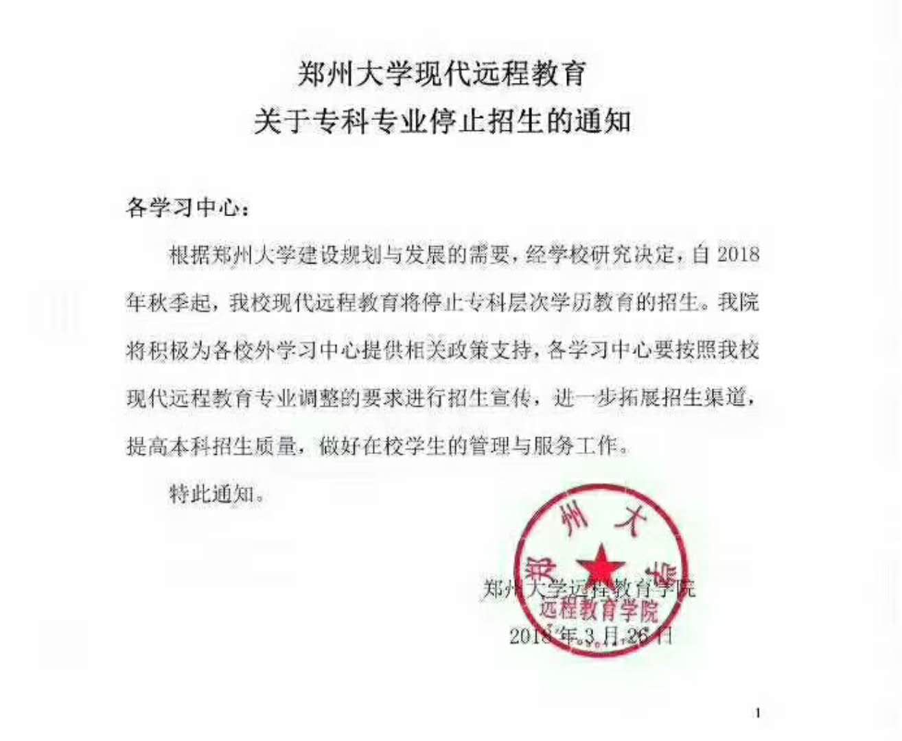 鄭州大學(xué)遠(yuǎn)程教育停止??茖I(yè)招生的通知