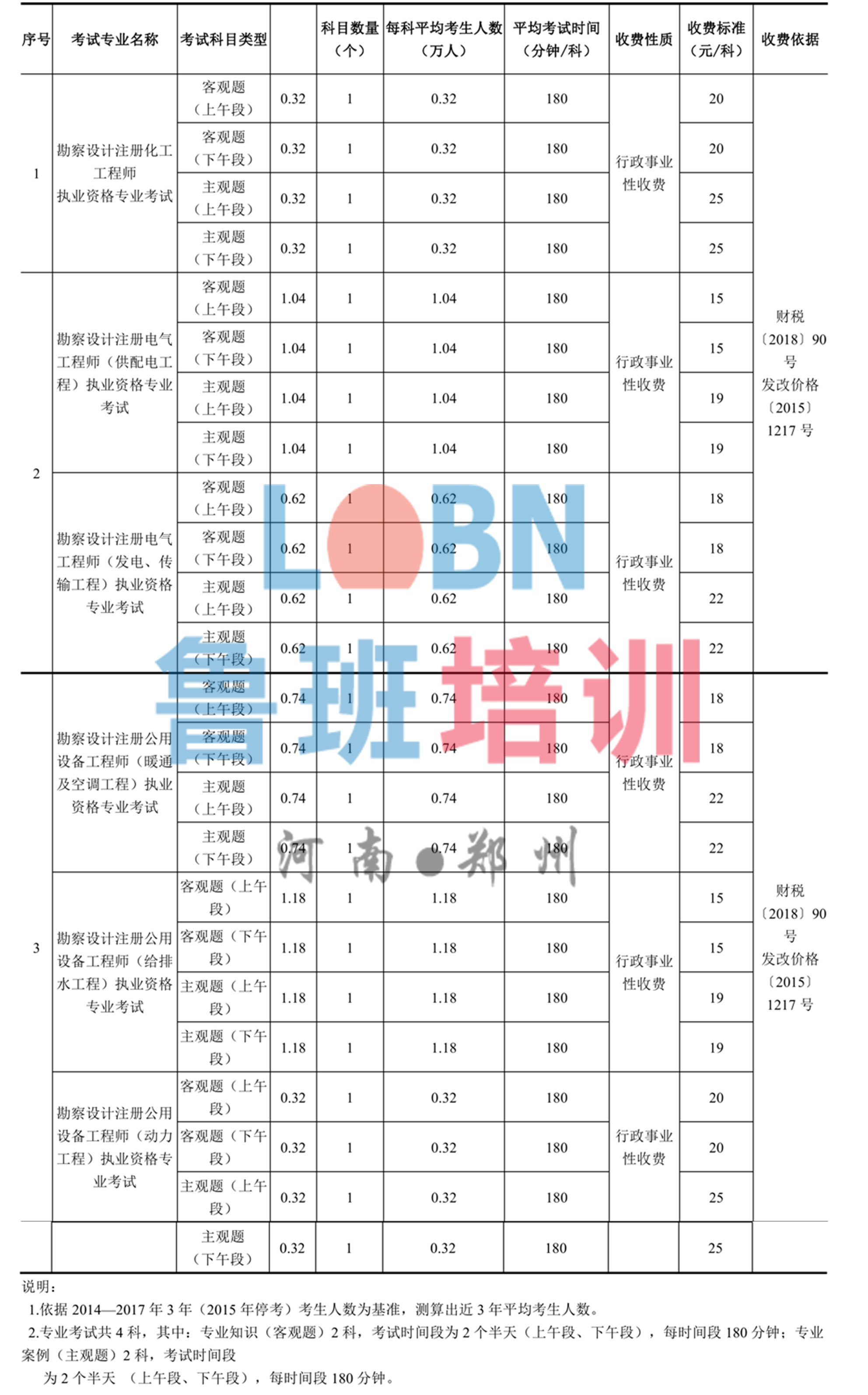 勘察設計注冊化工工程師等3項執業資格專業考試考務費收費標準核定表