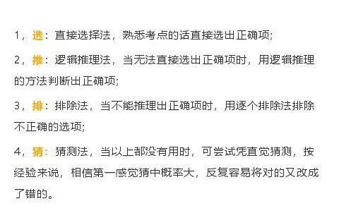 2,一定要選擇有把握的選項(xiàng),在沒有絕對(duì)把握的情況下最好不選;若對(duì)所有選項(xiàng)都沒有把握時(shí),可用猜測(cè)法選擇1項(xiàng),千萬別空著不選。