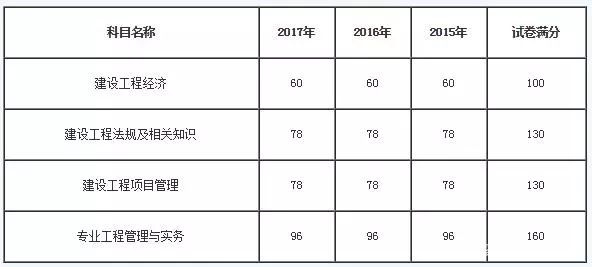 一級建造師考試各科目合格標準一般為其總分的60%,2014年~2017年一級建造師考試合格標準為:
